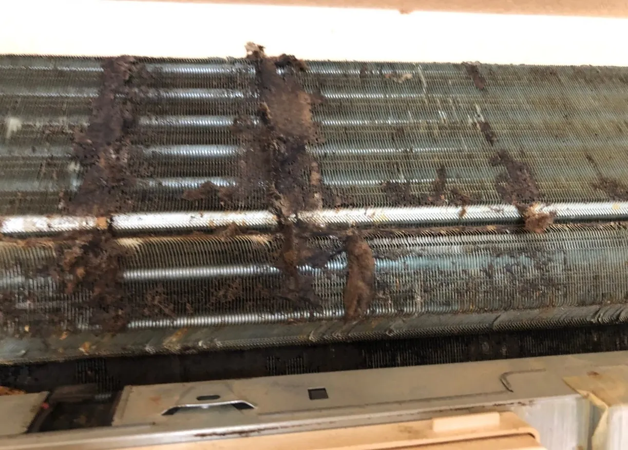 原因は・・・原因は・・・キッチンが付随するリビングのエアコンで、長年にわたりクリーニングしていなかったのが主な原因なのですが、キッチンと同じ空間にあるエアコンは必ず料理の油分が付着します。そこにホコリが絡まりカビや虫やネズミなどの餌になるのです。まさかと侮ってはいけません。野鼠などは直径1cmのドレンホースからでも侵入してくるのです。