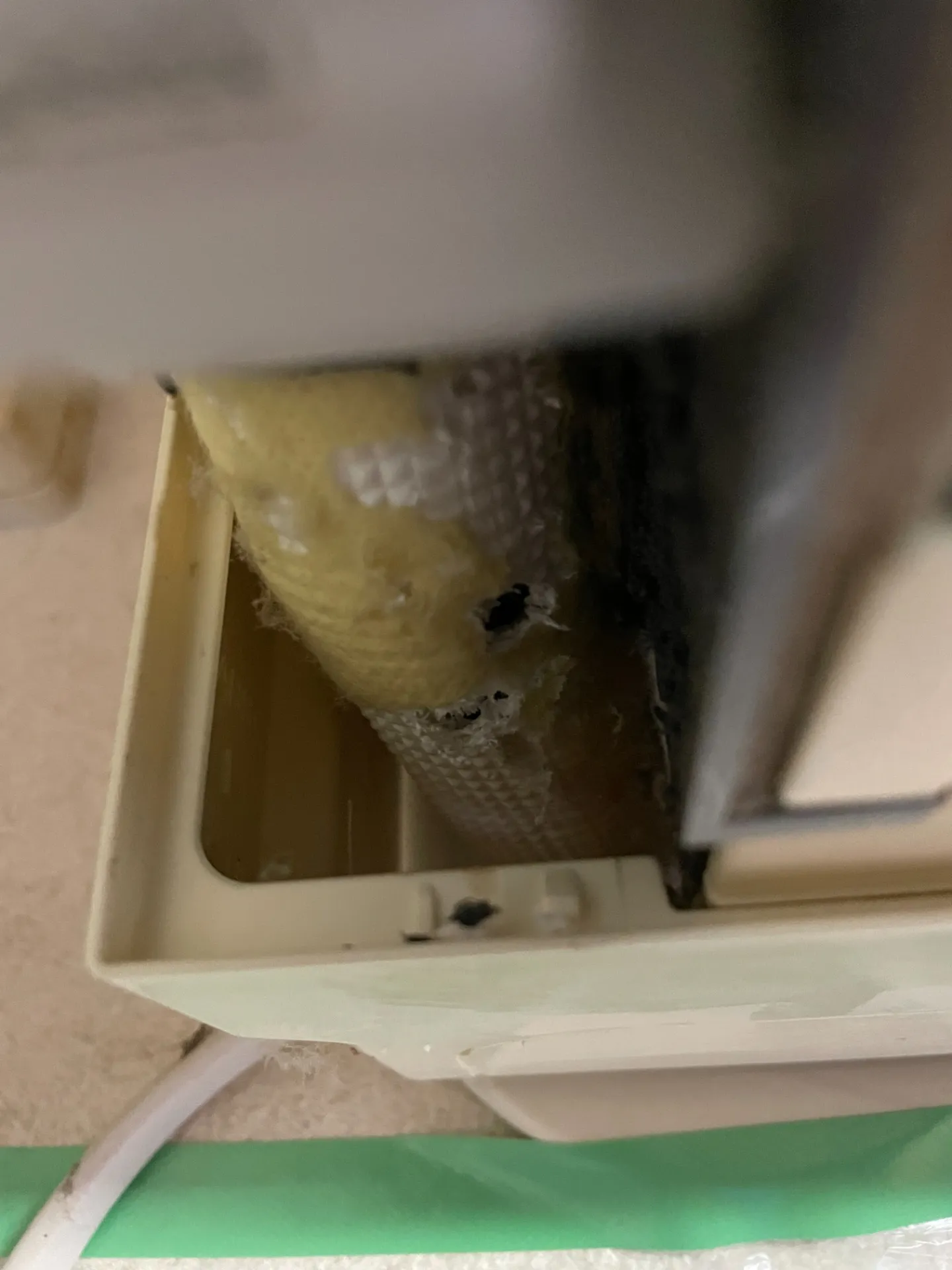隙間から野鼠が侵入して、エアコン内でホースの被覆をかじったようです。